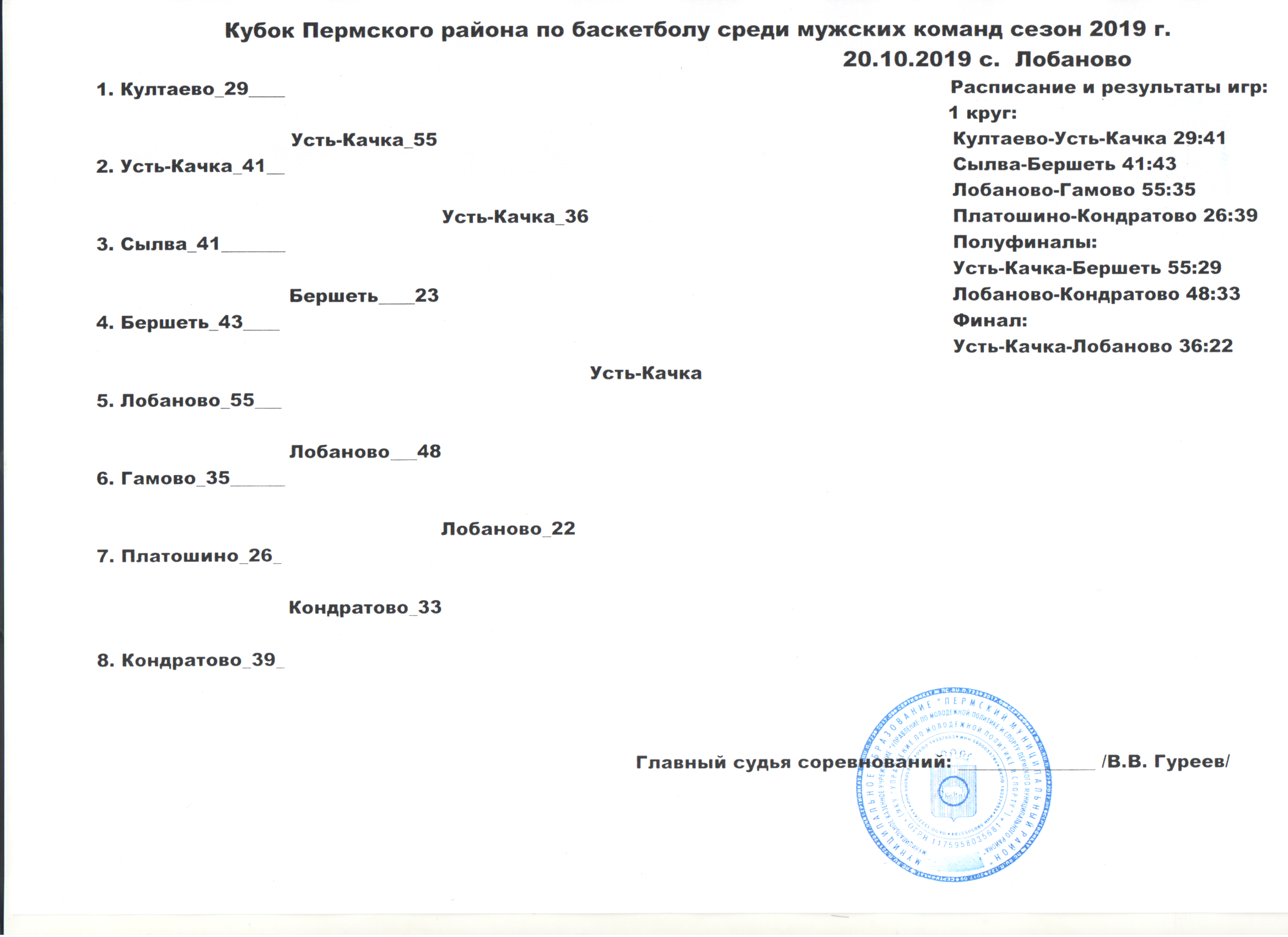 Итоги кубка Пермского района по баскетболу среди мужских команд 2019.