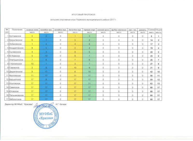 Итоги сельских спортивных игр Пермского муниципального района 2017 г. (состояние на 17.04.2017)