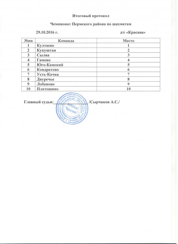 Итоговый протокол чемпионата Пермского района по шахматам.