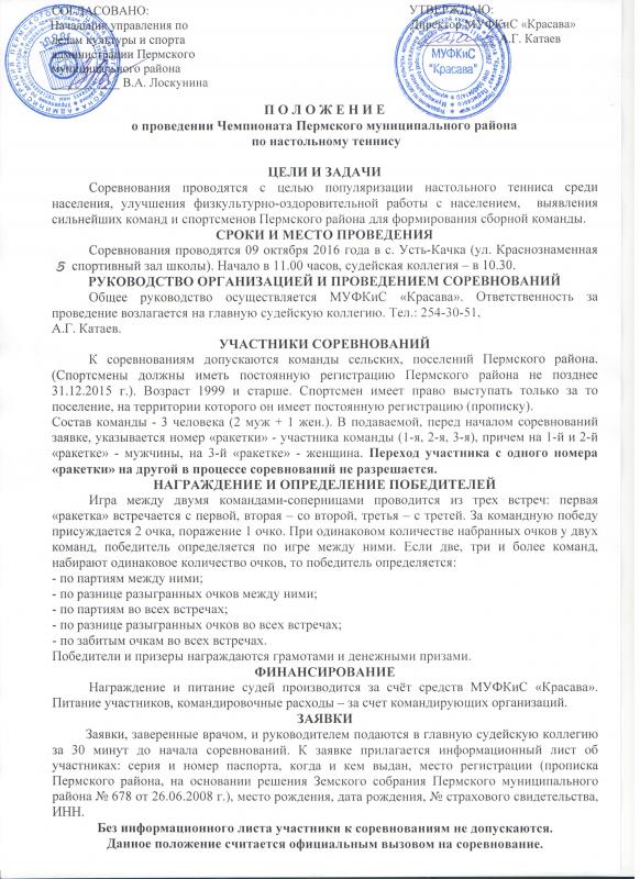 Командный чемпионат 2016 года по настольному теннису среди поселений Пермского муниципального района состоится 09 октября 2016г. на базе Усть-Качкинской школы.