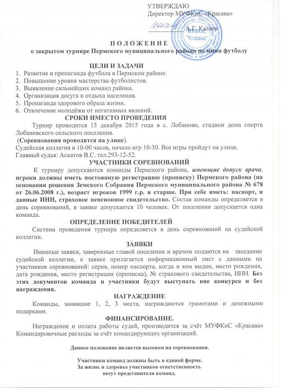 Закрытый турнир Пермского района по мини футболу пройдет 13 декабря 2015 г. на стадионе д/с с. Лобаново.